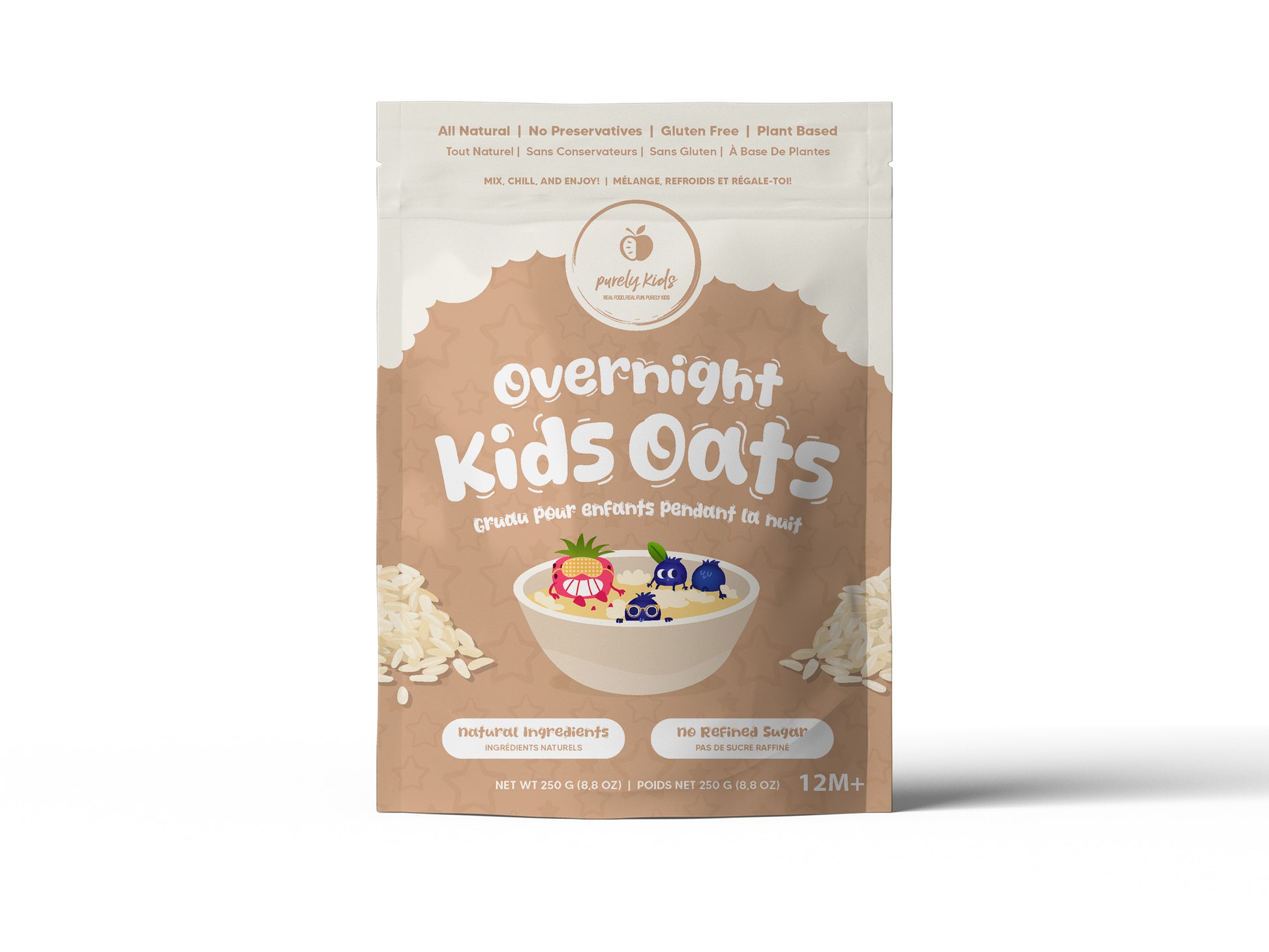 1️⃣ Versez ½ tasse de gruau de nuit Purely Kids – Chia, Avoine et Baies dans un bol, un pot ou un contenant avec couvercle.